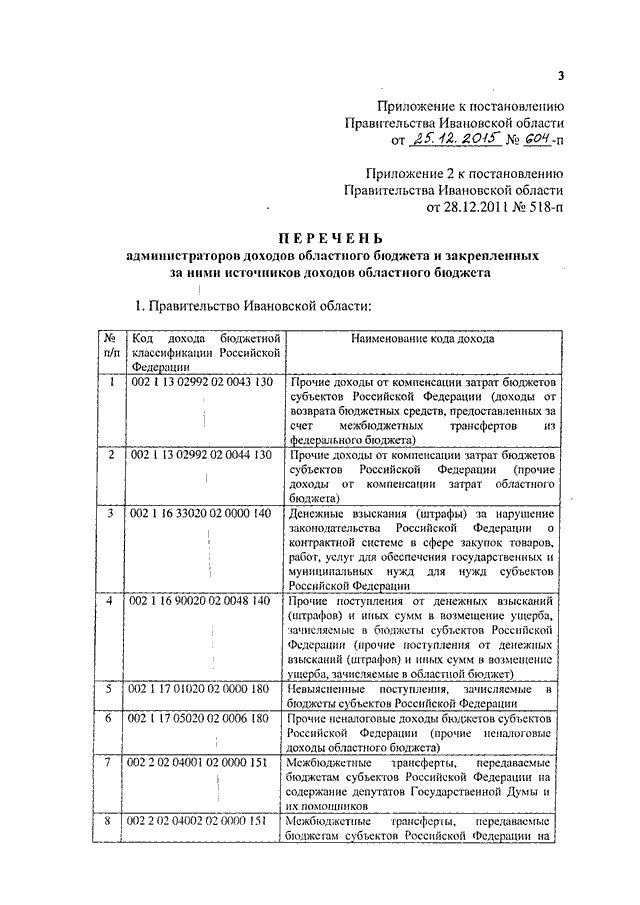 Постановление Правительства Ивановской области от 25.12.2015 N 604-п "О внесении изменений в постановление Правительства Ивановской области от 28.12.2011 N 518-п "Об утверждении Порядка осуществления Правительством Ивановской области и подведомственными ему областными казенными учреждениями бюджетных полномочий администраторов доходов областного бюджета" (вместе с "Перечнем администраторов доходов областного бюджета и закрепленных за ними источников доходов областного бюджета")