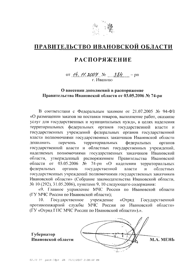 Распоряжение Правительства Ивановской области от 14.11.2007 N 384-рп "О внесении дополнений в распоряжение Правительства Ивановской области от 03.05.2006 N 74-рп"