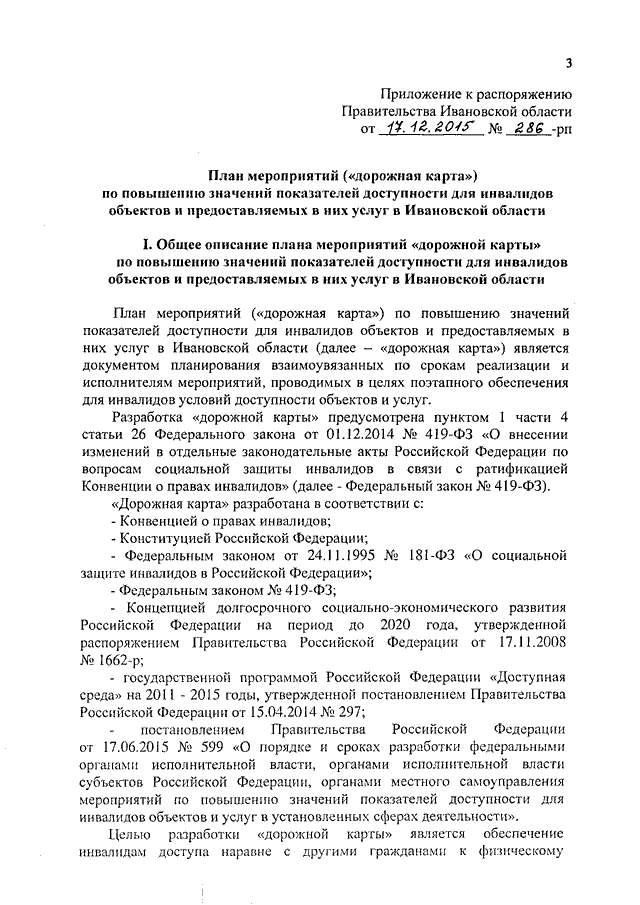 Распоряжение Правительства Ивановской области от 17.12.2015 N 286-рп "Об утверждении плана мероприятий ("дорожной карты") по повышению значений показателей доступности для инвалидов объектов и предоставляемых в них услуг в Ивановской области"