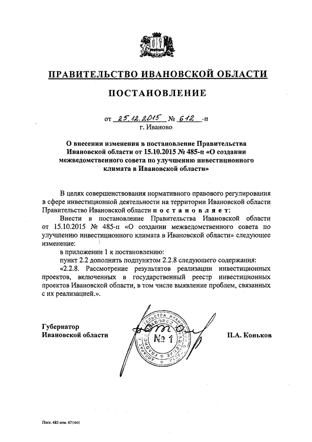 Постановление Правительства Ивановской области от 25.12.2015 N 612-п "О внесении изменения в постановление Правительства Ивановской области от 15.10.2015 N 485-п "О создании межведомственного совета по улучшению инвестиционного климата в Ивановской области"