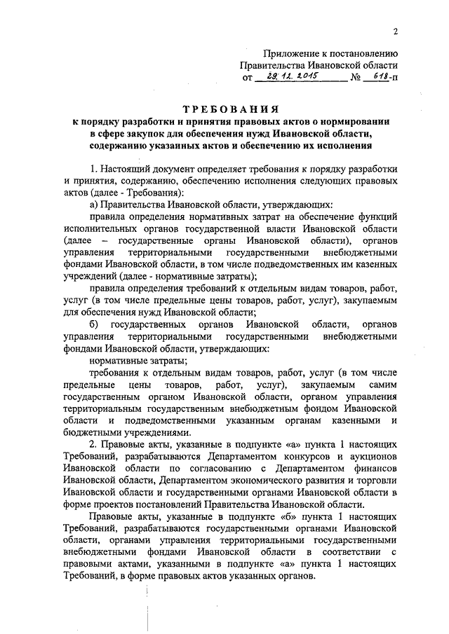 Постановление Правительства Ивановской области от 29.12.2015 N 618-п "Об утверждении требований к порядку разработки и принятия правовых актов о нормировании в сфере закупок для обеспечения нужд Ивановской области, содержанию указанных актов и обеспечению их исполнения"
