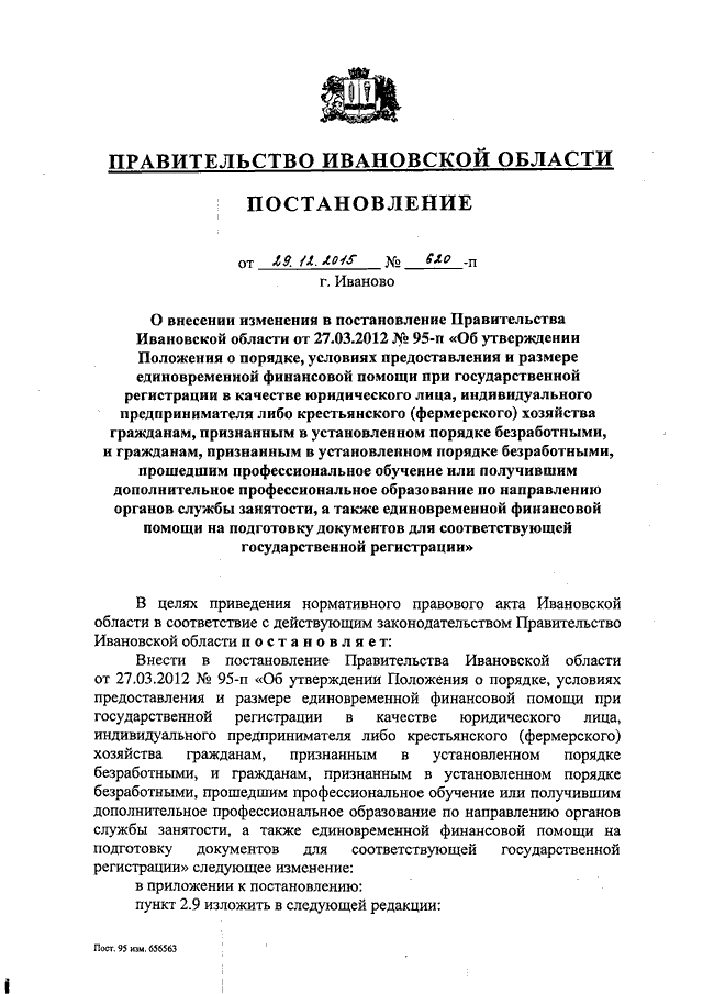 Постановление Правительства Ивановской области от 29.12.2015 N 620-п "О внесении изменения в постановление Правительства Ивановской области от 27.03.2012 N 95-п "Об утверждении Положения о порядке, условиях предоставления и размере единовременной финансовой помощи при государственной регистрации в качестве юридического лица, индивидуального предпринимателя либо крестьянского (фермерского) хозяйства гражданам, признанным в установленном порядке безработными, и гражданам, признанным в установленном порядке безработными, прошедшим профессиональное обучение или получившим дополнительное профессиональное образование по направлению органов службы занятости, а также единовременной финансовой помощи на подготовку документов для соответствующей государственной регистрации"