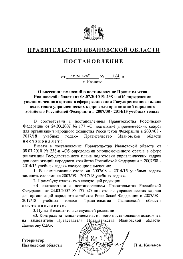 Постановление Правительства Ивановской области от 30.12.2015 N 633-п "О внесении изменений в постановление Правительства Ивановской области от 08.07.2010 N 238-п "Об определении уполномоченного органа в сфере реализации Государственного плана подготовки управленческих кадров для организаций народного хозяйства Российской Федерации в 2007/08 - 2014/15 учебных годах"