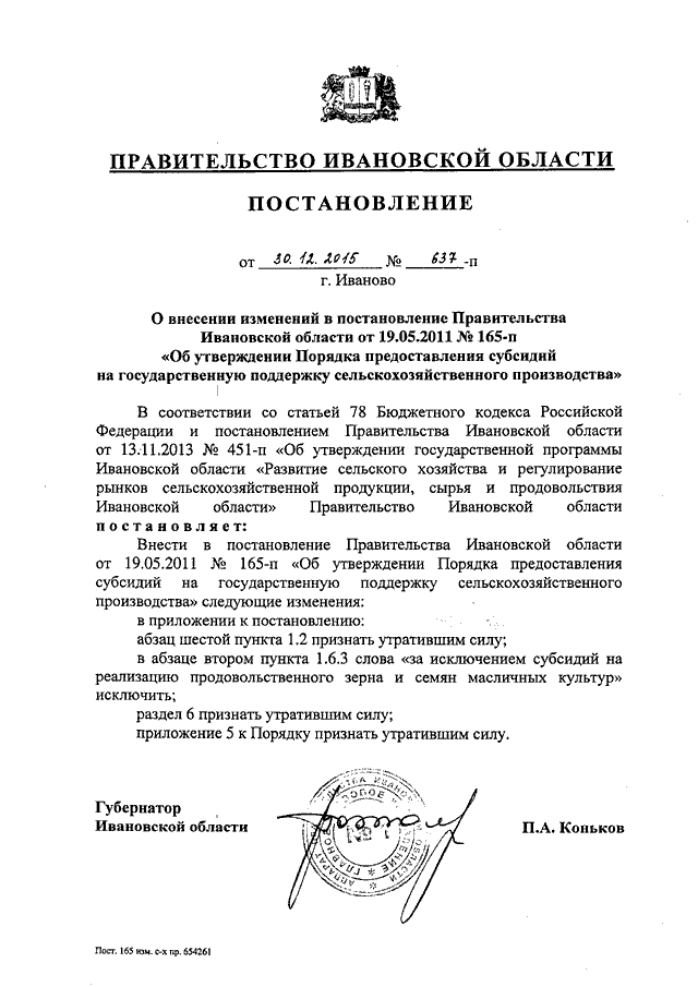 Постановление Правительства Ивановской области от 30.12.2015 N 637-п "О внесении изменений в постановление Правительства Ивановской области от 19.05.2011 N 165-п "Об утверждении Порядка предоставления субсидий на государственную поддержку сельскохозяйственного производства"