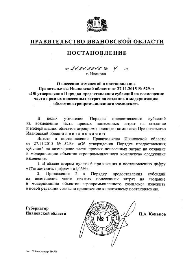Постановление Правительства Ивановской области от 21.01.2016 N 4-п "О внесении изменений в постановление Правительства Ивановской области от 27.11.2015 N 529-п "Об утверждении Порядка предоставления субсидий на возмещение части прямых понесенных затрат на создание и модернизацию объектов агропромышленного комплекса"