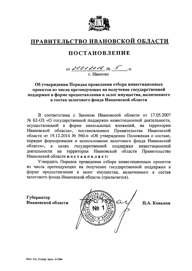 Постановление Правительства Ивановской области от 21.01.2016 N 5-п "Об утверждении Порядка проведения отбора инвестиционных проектов из числа претендующих на получение государственной поддержки в форме предоставления в залог имущества, включенного в состав залогового фонда Ивановской области"