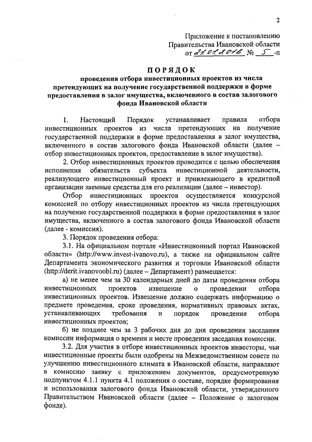 Постановление Правительства Ивановской области от 21.01.2016 N 5-п "Об утверждении Порядка проведения отбора инвестиционных проектов из числа претендующих на получение государственной поддержки в форме предоставления в залог имущества, включенного в состав залогового фонда Ивановской области"