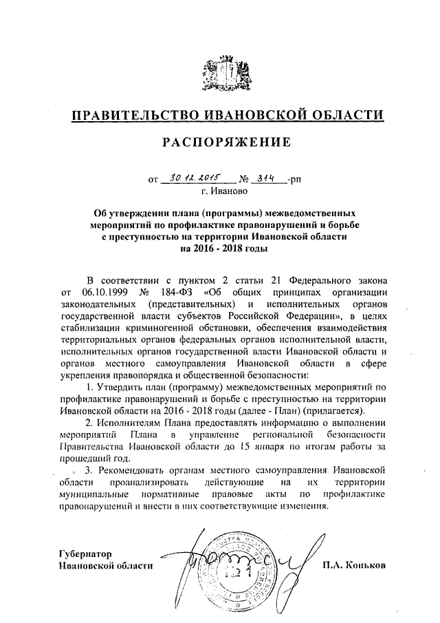 Распоряжение Правительства Ивановской области от 30.12.2015 N 314-рп "Об утверждении плана (программы) межведомственных мероприятий по профилактике правонарушений и борьбе с преступностью на территории Ивановской области на 2016 - 2018 годы"