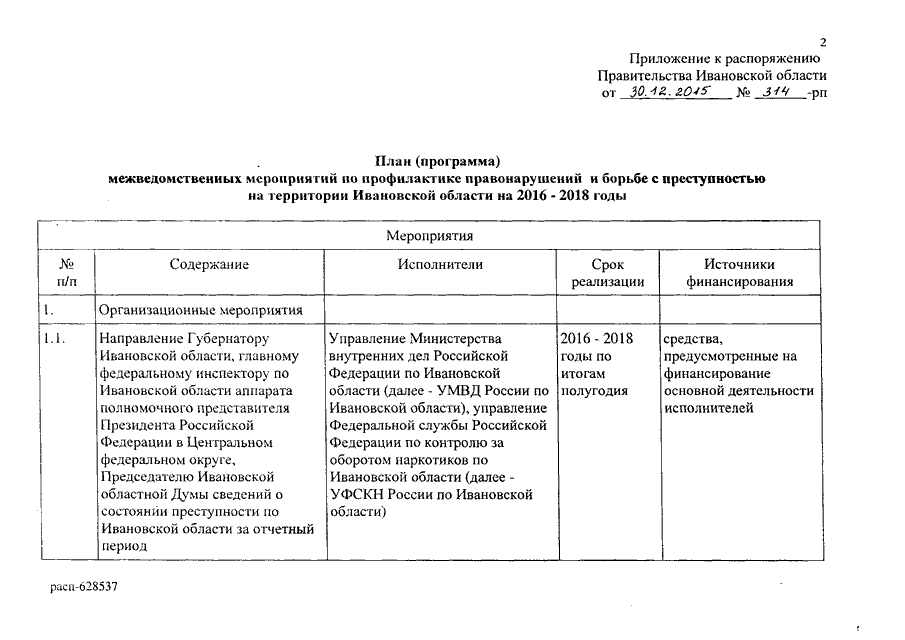 Распоряжение Правительства Ивановской области от 30.12.2015 N 314-рп "Об утверждении плана (программы) межведомственных мероприятий по профилактике правонарушений и борьбе с преступностью на территории Ивановской области на 2016 - 2018 годы"