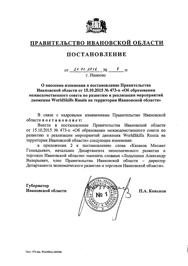 Постановление Правительства Ивановской области от 21.01.2016 N 7-п "О внесении изменения в постановление Правительства Ивановской области от 15.10.2015 N 473-п "Об образовании межведомственного совета по развитию и реализации мероприятий движения WorldSkills Russia на территории Ивановской области"