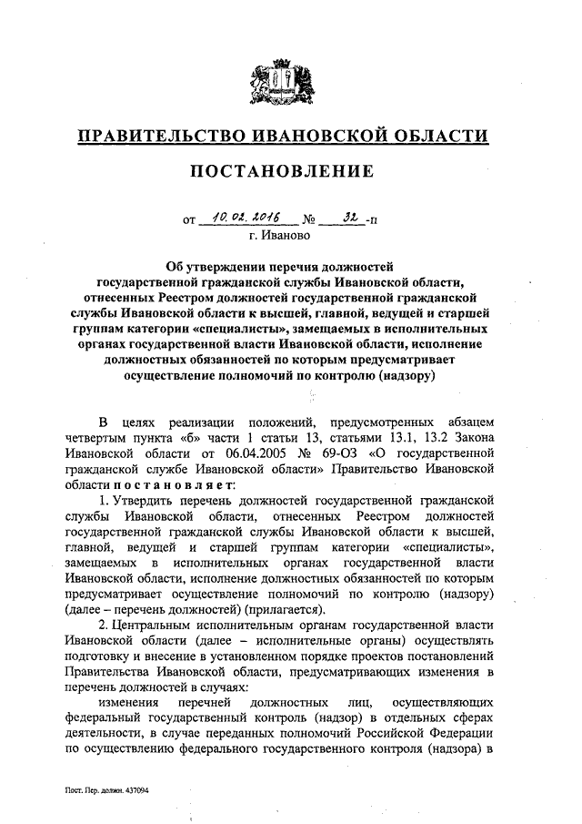 Постановление Правительства Ивановской области от 10.02.2016 N 32-п "Об утверждении перечня должностей государственной гражданской службы Ивановской области, отнесенных Реестром должностей государственной гражданской службы Ивановской области к высшей, главной, ведущей и старшей группам категории "специалисты", замещаемых в исполнительных органах государственной власти Ивановской области, исполнение должностных обязанностей по которым предусматривает осуществление полномочий по контролю (надзору)"
