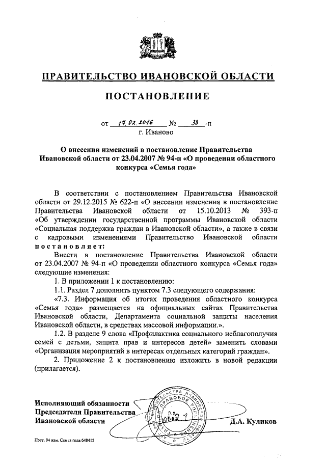 Постановление Правительства Ивановской области от 17.02.2016 N 38-п "О внесении изменений в постановление Правительства Ивановской области от 23.04.2007 N 94-п "О проведении областного конкурса "Семья года"