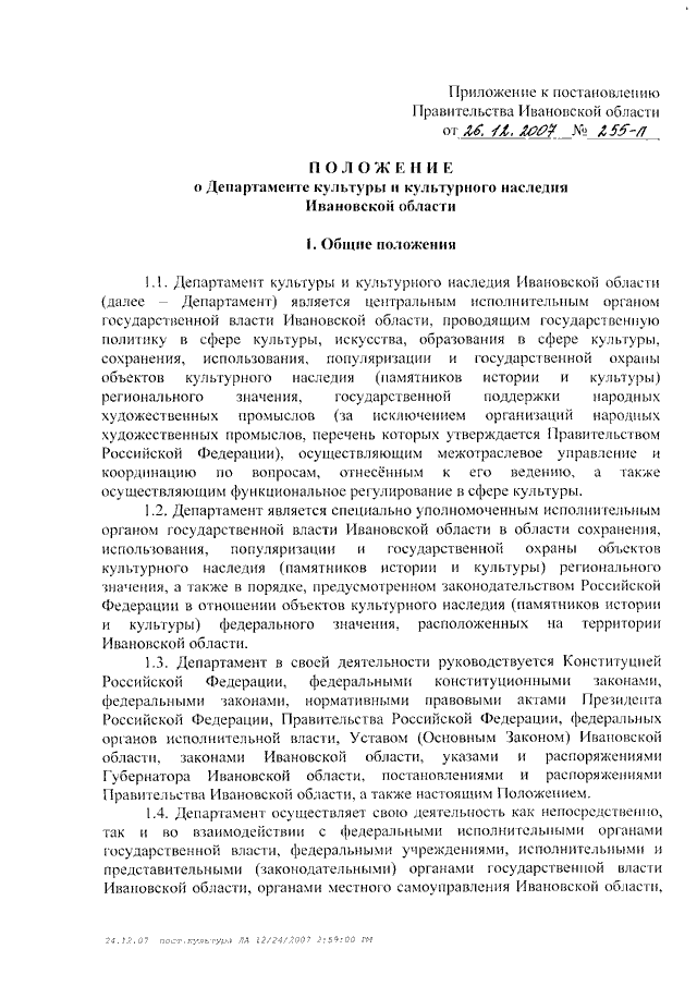 Постановление Правительства Ивановской области от 26.12.2007 N 255-п "Об утверждении Положения о Департаменте культуры и культурного наследия Ивановской области"