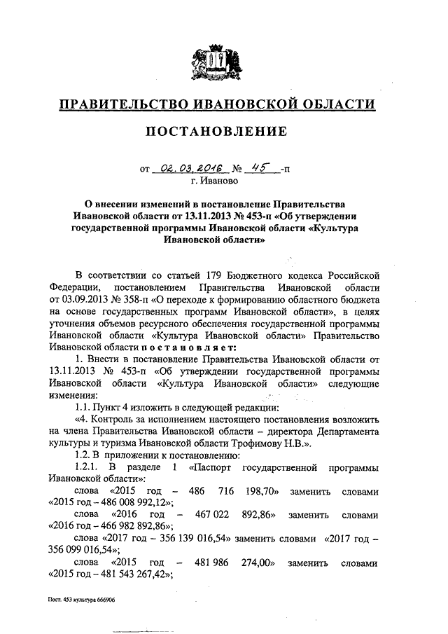 Постановление Правительства Ивановской области от 02.03.2016 N 45-п "О внесении изменений в постановление Правительства Ивановской области от 13.11.2013 N 453-п "Об утверждении государственной программы Ивановской области "Культура Ивановской области"