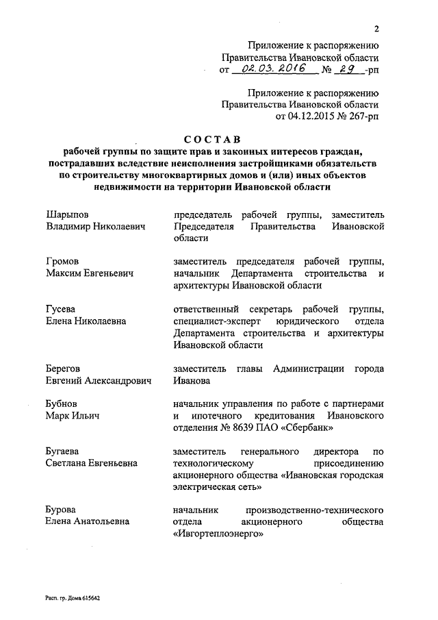 Распоряжение Правительства Ивановской области от 02.03.2016 N 29-рп "О внесении изменения в распоряжение Правительства Ивановской области от 04.12.2015 N 267-рп "О создании рабочей группы по защите прав и законных интересов граждан, пострадавших вследствие неисполнения застройщиками обязательств по строительству многоквартирных домов и (или) иных объектов недвижимости на территории Ивановской области"