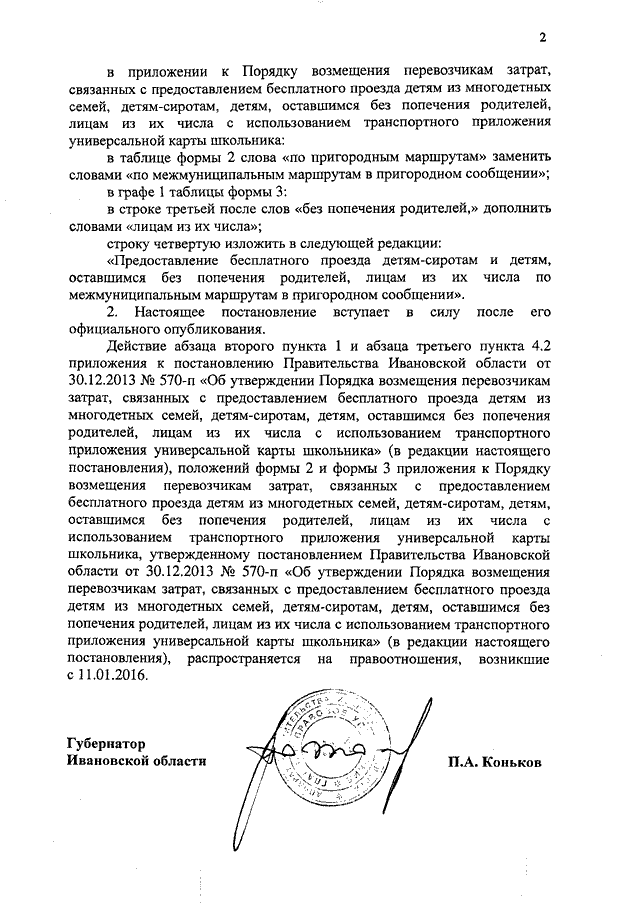 Постановление Правительства Ивановской области от 02.03.2016 N 48-п "О внесении изменений в постановление Правительства Ивановской области от 30.12.2013 N 570-п "Об утверждении Порядка возмещения перевозчикам затрат, связанных с предоставлением бесплатного проезда детям из многодетных семей, детям-сиротам, детям, оставшимся без попечения родителей, лицам из их числа с использованием транспортного приложения универсальной карты школьника"