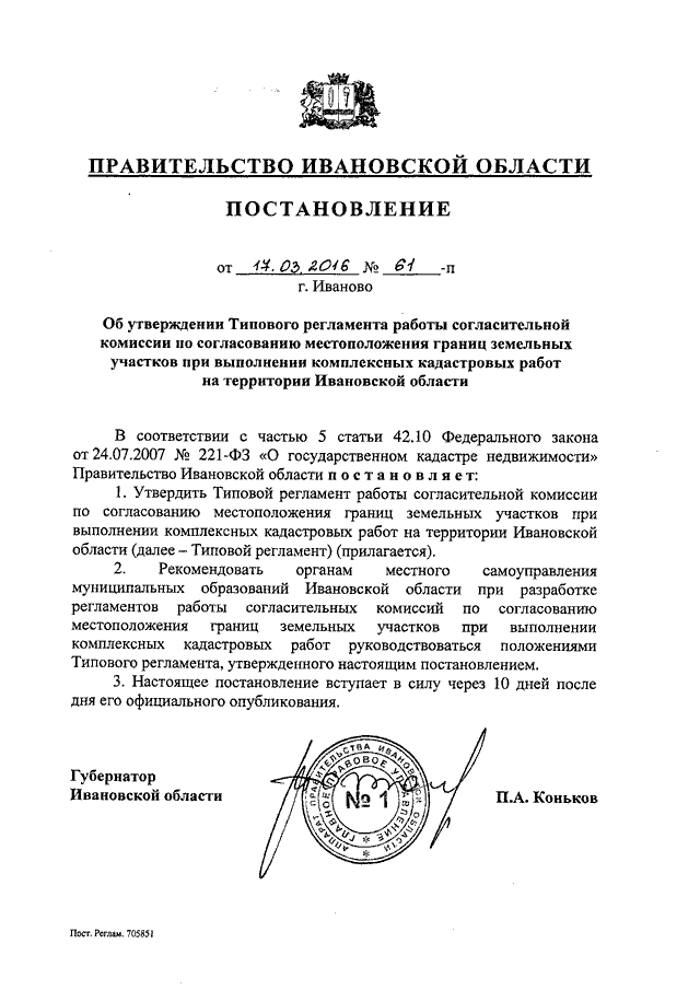 Постановление Правительства Ивановской области от 17.03.2016 N 61-п "Об утверждении Типового регламента работы согласительной комиссии по согласованию местоположения границ земельных участков при выполнении комплексных кадастровых работ на территории Ивановской области"
