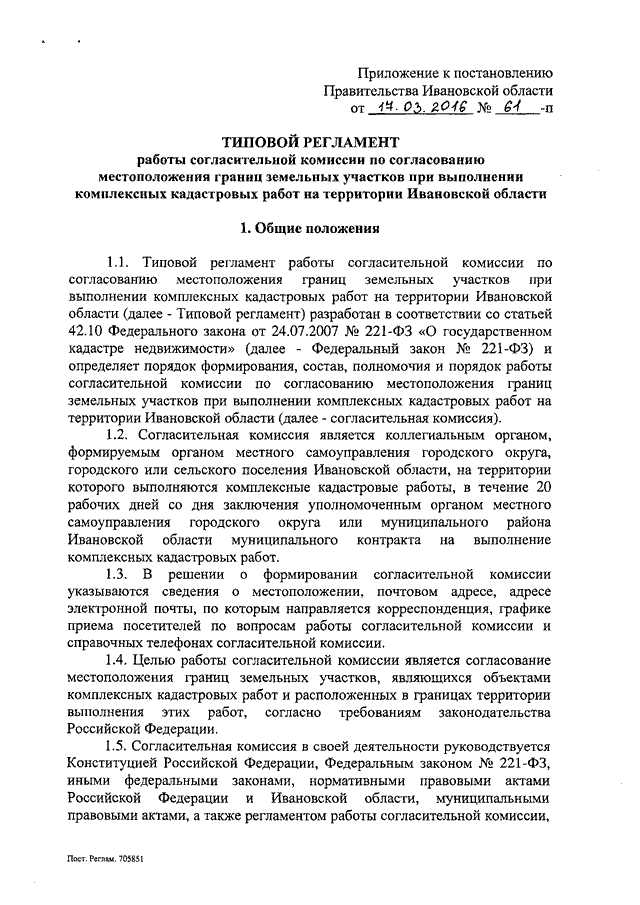 Постановление Правительства Ивановской области от 17.03.2016 N 61-п "Об утверждении Типового регламента работы согласительной комиссии по согласованию местоположения границ земельных участков при выполнении комплексных кадастровых работ на территории Ивановской области"
