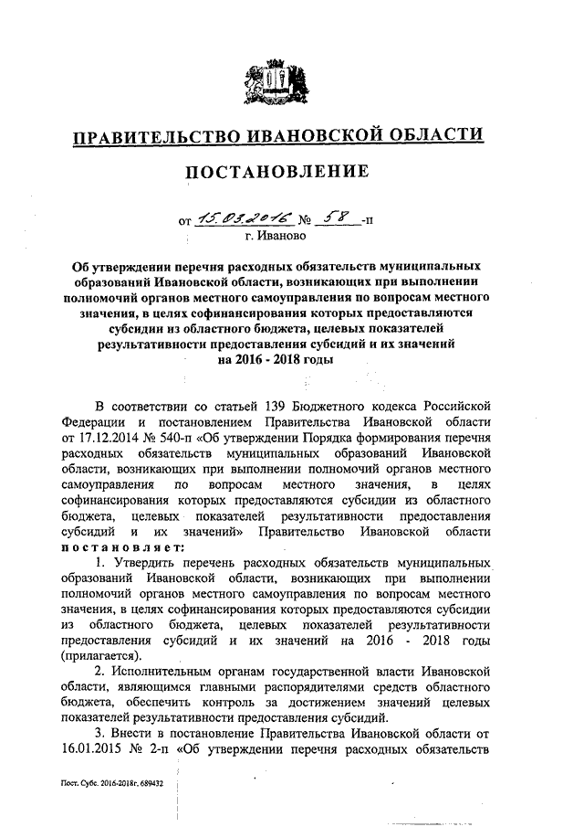 Постановление Правительства Ивановской области от 15.03.2016 N 58-п "Об утверждении перечня расходных обязательств муниципальных образований Ивановской области, возникающих при выполнении полномочий органов местного самоуправления по вопросам местного значения, в целях софинансирования которых предоставляются субсидии из областного бюджета, целевых показателей результативности предоставления субсидий и их значений на 2016 - 2018 годы"