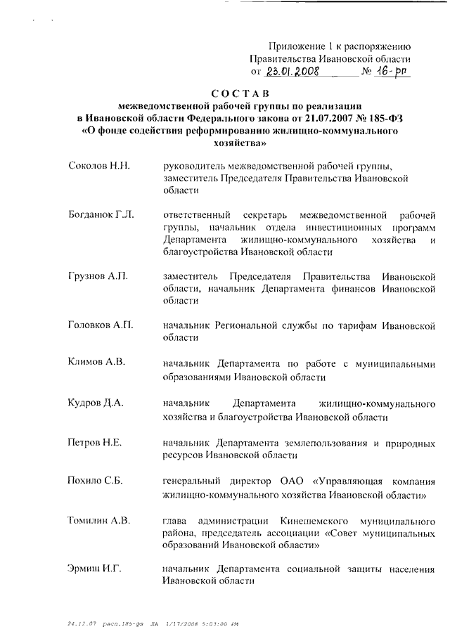 Распоряжение Правительства Ивановской области от 23.01.2008 N 16-рп "О мерах по реализации в Ивановской области Федерального закона от 21.07.2007 N 185-ФЗ "О фонде содействия реформированию жилищно-коммунального хозяйства" (вместе с "Планом мероприятий по реализации в Ивановской области Федерального закона от 21.07.2007 N 185-ФЗ "О фонде содействия реформированию жилищно-коммунального хозяйства")