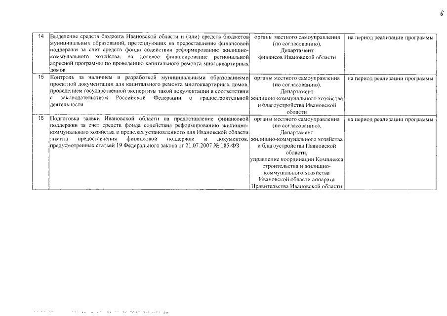 Распоряжение Правительства Ивановской области от 23.01.2008 N 16-рп "О мерах по реализации в Ивановской области Федерального закона от 21.07.2007 N 185-ФЗ "О фонде содействия реформированию жилищно-коммунального хозяйства" (вместе с "Планом мероприятий по реализации в Ивановской области Федерального закона от 21.07.2007 N 185-ФЗ "О фонде содействия реформированию жилищно-коммунального хозяйства")