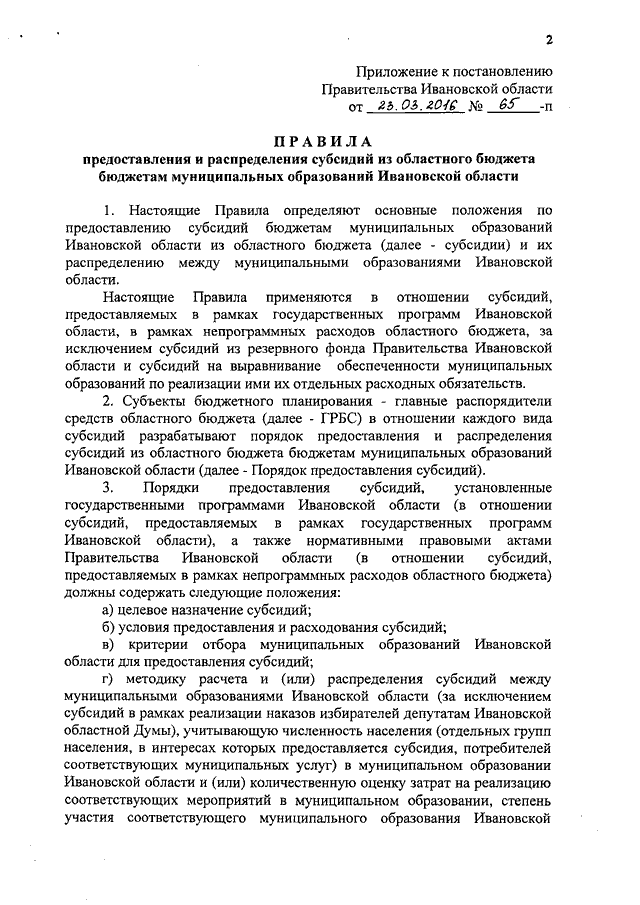 Постановление Правительства Ивановской области от 23.03.2016 N 65-п "О предоставлении и распределении субсидий из областного бюджета бюджетам муниципальных образований Ивановской области" (вместе с "Правилами предоставления и распределения субсидий из областного бюджета бюджетам муниципальных образований Ивановской области")