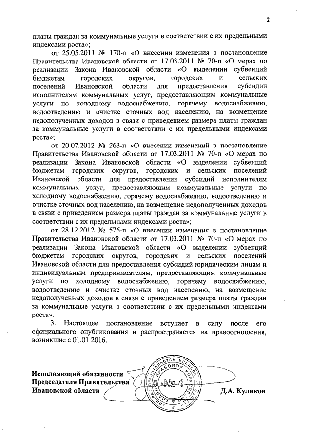 Постановление Правительства Ивановской области от 25.03.2016 N 73-п "О предоставлении субсидий организациям водопроводно-канализационного хозяйства и организациям, осуществляющим горячее водоснабжение, на возмещение недополученных доходов, образующихся в результате применения льготных тарифов на горячее водоснабжение, холодное водоснабжение и (или) водоотведение" (вместе с "Порядком предоставления субсидий организациям водопроводно-канализационного хозяйства и организациям, осуществляющим горячее водоснабжение, на возмещение недополученных доходов, образующихся в результате применения льготных тарифов на горячее водоснабжение, холодное водоснабжение и (или) водоотведение")