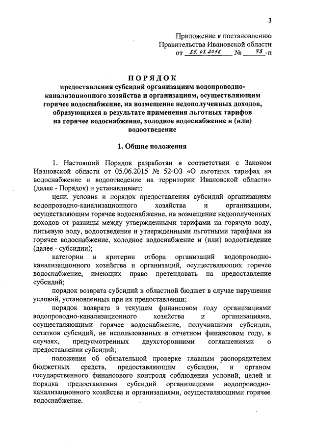 Постановление Правительства Ивановской области от 25.03.2016 N 73-п "О предоставлении субсидий организациям водопроводно-канализационного хозяйства и организациям, осуществляющим горячее водоснабжение, на возмещение недополученных доходов, образующихся в результате применения льготных тарифов на горячее водоснабжение, холодное водоснабжение и (или) водоотведение" (вместе с "Порядком предоставления субсидий организациям водопроводно-канализационного хозяйства и организациям, осуществляющим горячее водоснабжение, на возмещение недополученных доходов, образующихся в результате применения льготных тарифов на горячее водоснабжение, холодное водоснабжение и (или) водоотведение")