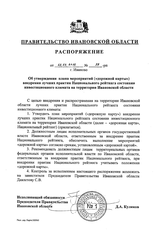 Распоряжение Правительства Ивановской области от 23.03.2016 N 39-рп "Об утверждении плана мероприятий ("дорожной карты") внедрения лучших практик Национального рейтинга состояния инвестиционного климата на территории Ивановской области"