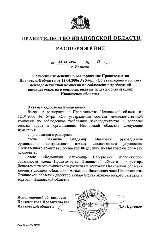 Распоряжение Правительства Ивановской области от 23.03.2016 N 38-рп "О внесении изменений в распоряжение Правительства Ивановской области от 12.04.2006 N 54-рп "Об утверждении состава межведомственной комиссии по соблюдению требований законодательства в вопросах оплаты труда в организациях Ивановской области"