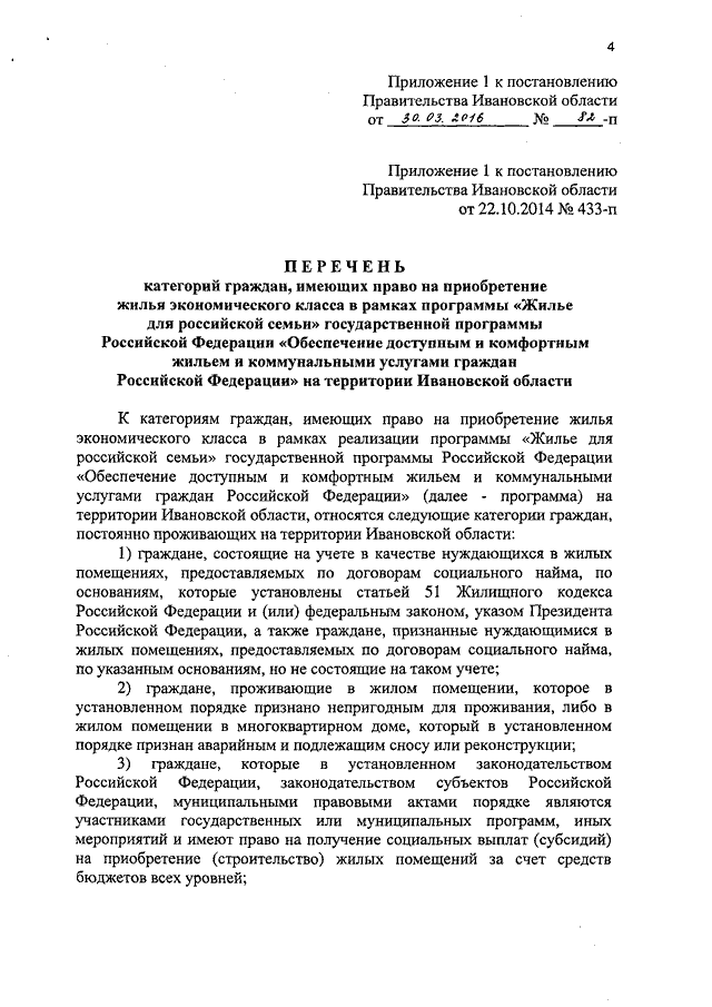 Постановление Правительства Ивановской области от 30.03.2016 N 82-п "О внесении изменений в постановление Правительства Ивановской области от 22.10.2014 N 433-п "Об утверждении перечня категорий граждан, имеющих право на приобретение жилья экономического класса, Порядка формирования списков граждан, имеющих право на приобретение жилья экономического класса, и сводного по Ивановской области реестра таких граждан в рамках программы "Жилье для российской семьи" государственной программы Российской Федерации "Обеспечение доступным и комфортным жильем и коммунальными услугами граждан Российской Федерации" (вместе с "Перечнем документов, представляемых для включения в список граждан, имеющих право на приобретение жилья экономического класса в рамках программы "Жилье для российской семьи" государственной программы Российской Федерации "Обеспечение доступным и комфортным жильем и коммунальными услугами граждан Российской Федерации")
