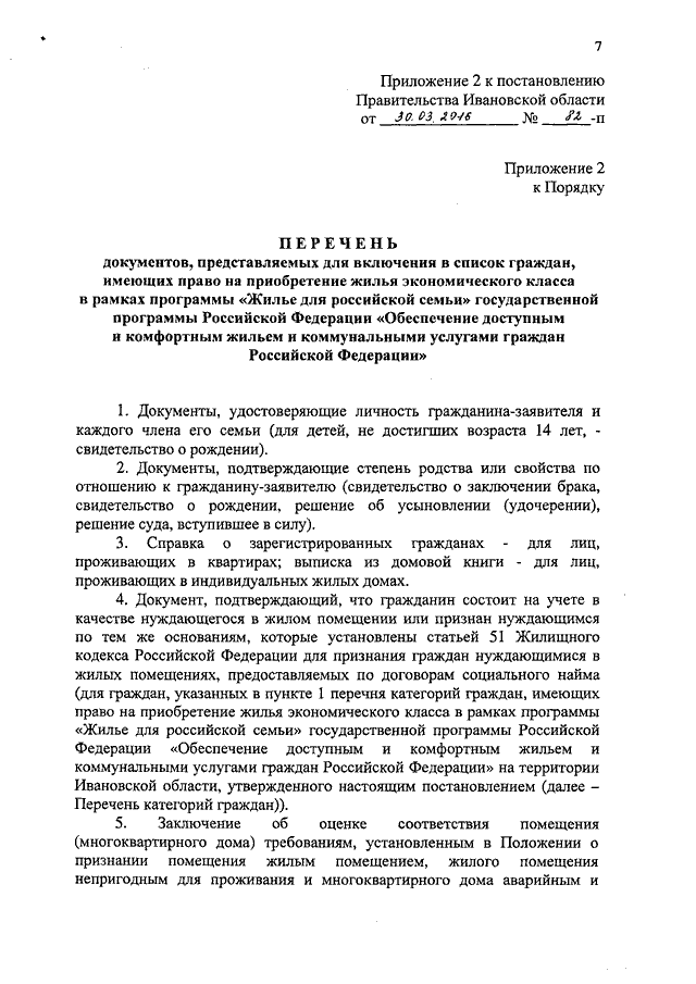 Постановление Правительства Ивановской области от 30.03.2016 N 82-п "О внесении изменений в постановление Правительства Ивановской области от 22.10.2014 N 433-п "Об утверждении перечня категорий граждан, имеющих право на приобретение жилья экономического класса, Порядка формирования списков граждан, имеющих право на приобретение жилья экономического класса, и сводного по Ивановской области реестра таких граждан в рамках программы "Жилье для российской семьи" государственной программы Российской Федерации "Обеспечение доступным и комфортным жильем и коммунальными услугами граждан Российской Федерации" (вместе с "Перечнем документов, представляемых для включения в список граждан, имеющих право на приобретение жилья экономического класса в рамках программы "Жилье для российской семьи" государственной программы Российской Федерации "Обеспечение доступным и комфортным жильем и коммунальными услугами граждан Российской Федерации")