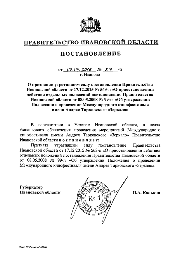 Постановление Правительства Ивановской области от 06.04.2016 N 87-п "О признании утратившим силу постановления Правительства Ивановской области от 17.12.2015 N 563-п "О приостановлении действия отдельных положений постановления Правительства Ивановской области от 08.05.2008 N 99-п "Об утверждении Положения о проведении Международного кинофестиваля имени Андрея Тарковского "Зеркало"