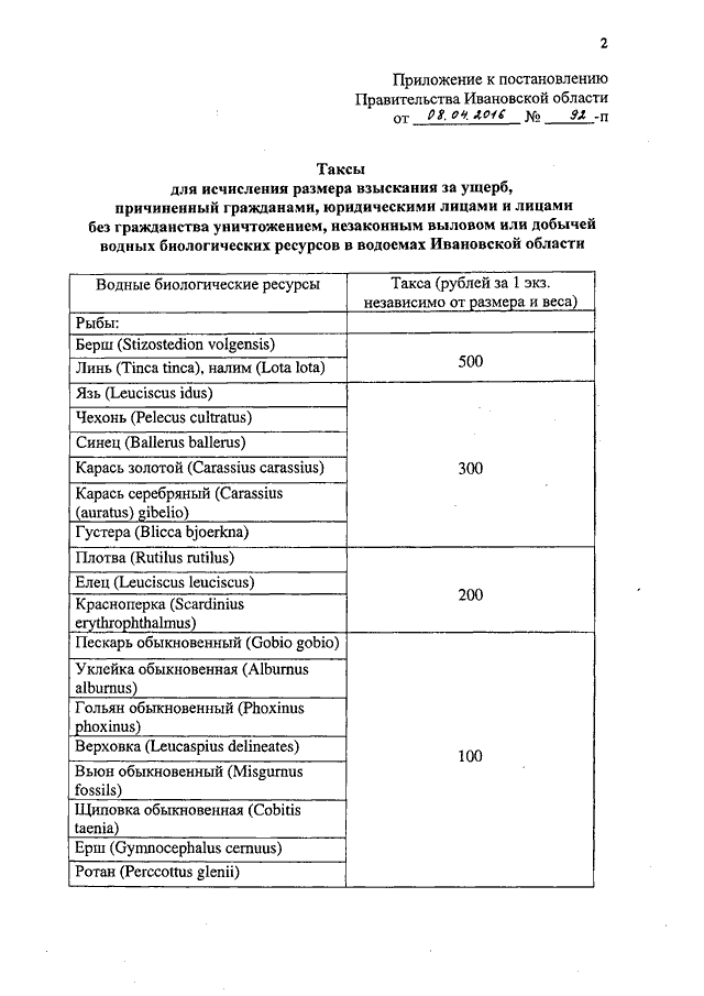 Постановление Правительства Ивановской области от 08.04.2016 N 92-п "Об утверждении такс для исчисления размера взыскания за ущерб, причиненный водным биологическим ресурсам"