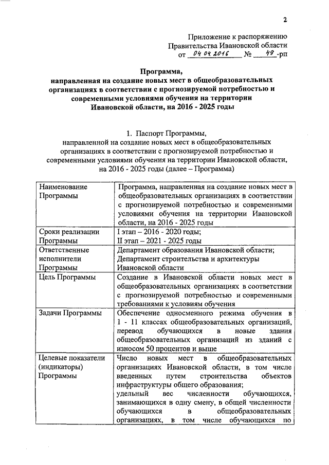 Распоряжение Правительства Ивановской области от 04.04.2016 N 49-рп "Об утверждении Программы, направленной на создание новых мест в общеобразовательных организациях в соответствии с прогнозируемой потребностью и современными условиями обучения на территории Ивановской области, на 2016 - 2025 годы"