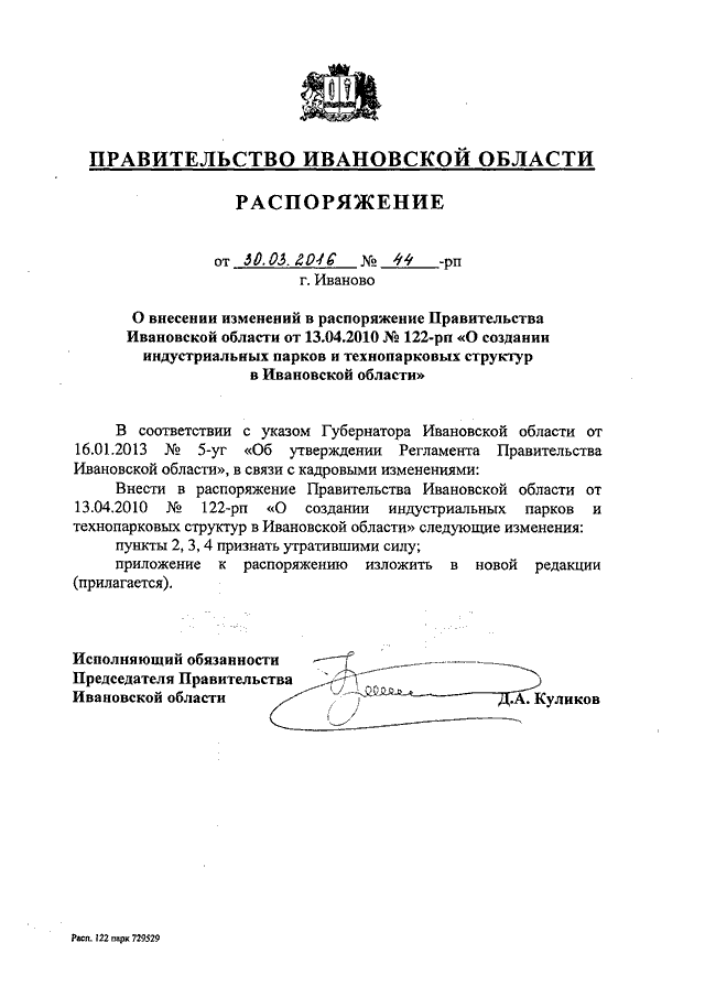 Распоряжение Правительства Ивановской области от 30.03.2016 N 44-рп "О внесении изменений в распоряжение Правительства Ивановской области от 13.04.2010 N 122-рп "О создании индустриальных парков и технопарковых структур в Ивановской области"