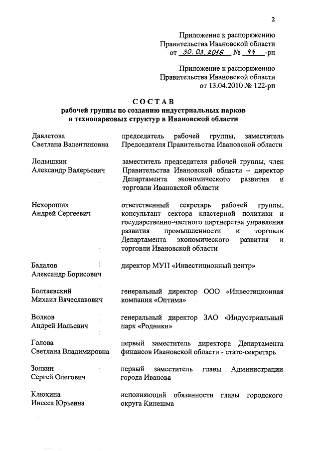 Распоряжение Правительства Ивановской области от 30.03.2016 N 44-рп "О внесении изменений в распоряжение Правительства Ивановской области от 13.04.2010 N 122-рп "О создании индустриальных парков и технопарковых структур в Ивановской области"