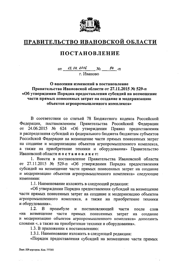Постановление Правительства Ивановской области от 13.04.2016 N 94-п "О внесении изменений в постановление Правительства Ивановской области от 27.11.2015 N 529-п "Об утверждении порядка предоставления субсидий на возмещение части прямых понесенных затрат на создание и модернизацию объектов агропромышленного комплекса"