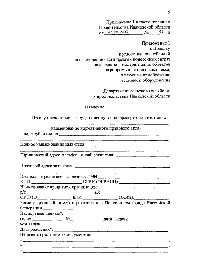 Постановление Правительства Ивановской области от 13.04.2016 N 94-п "О внесении изменений в постановление Правительства Ивановской области от 27.11.2015 N 529-п "Об утверждении порядка предоставления субсидий на возмещение части прямых понесенных затрат на создание и модернизацию объектов агропромышленного комплекса"