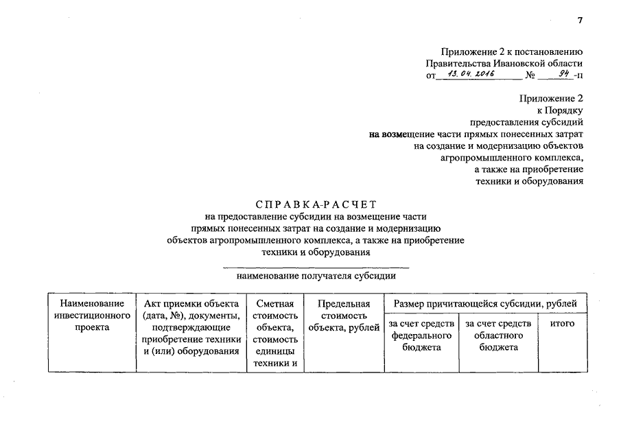 Постановление Правительства Ивановской области от 13.04.2016 N 94-п "О внесении изменений в постановление Правительства Ивановской области от 27.11.2015 N 529-п "Об утверждении порядка предоставления субсидий на возмещение части прямых понесенных затрат на создание и модернизацию объектов агропромышленного комплекса"
