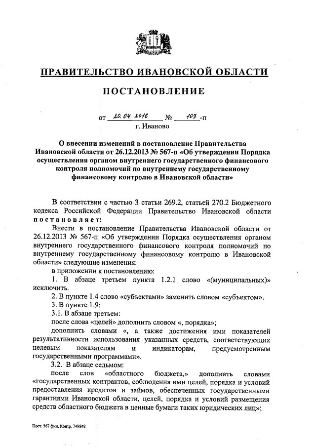 Постановление Правительства Ивановской области от 20.04.2016 N 107-п "О внесении изменений в постановление Правительства Ивановской области от 26.12.2013 N 567-п "Об утверждении Порядка осуществления органом внутреннего государственного финансового контроля полномочий по внутреннему государственному финансовому контролю в Ивановской области"