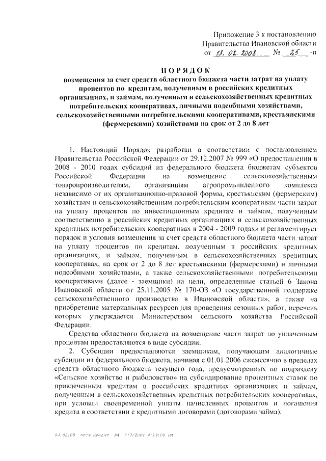 Постановление Правительства Ивановской области от 13.02.2008 N 25-п "Об утверждении Порядков предоставления из областного бюджета возмещения части затрат на уплату процентов по кредитам (займам), полученным сельскохозяйственными товаропроизводителями и организациями агропромышленного комплекса" (вместе с "Порядком возмещения за счет средств областного бюджета части затрат на уплату процентов по кредитам, полученным в российских кредитных организациях, и займам, полученным в сельскохозяйственных кредитных потребительских кооперативах, на срок до одного года сельскохозяйственными товаропроизводителями и организациями агропромышленного комплекса", "Порядком возмещения за счет средств областного бюджета части затрат на уплату процентов по инвестиционным кредитам, полученным в российских кредитных организациях, и займам, полученным в сельскохозяйственных кредитных потребительских кооперативах, на срок от 2 до 8 лет сельскохозяйственными товаропроизводителями", "Порядком возмещения за счет средств областного бюджета части затрат на уплату процентов по кредитам, полученным в российских кредитных организациях, и займам, полученным в сельскохозяйственных кредитных потребительских кооперативах, личными подсобными хозяйствами, сельскохозяйственными потребительскими кооперативами, крестьянскими (фермерскими) хозяйствами на срок от 2 до 8 лет")