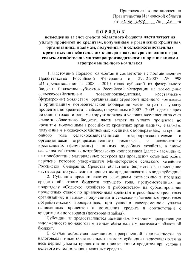 Постановление Правительства Ивановской области от 13.02.2008 N 25-п "Об утверждении Порядков предоставления из областного бюджета возмещения части затрат на уплату процентов по кредитам (займам), полученным сельскохозяйственными товаропроизводителями и организациями агропромышленного комплекса" (вместе с "Порядком возмещения за счет средств областного бюджета части затрат на уплату процентов по кредитам, полученным в российских кредитных организациях, и займам, полученным в сельскохозяйственных кредитных потребительских кооперативах, на срок до одного года сельскохозяйственными товаропроизводителями и организациями агропромышленного комплекса", "Порядком возмещения за счет средств областного бюджета части затрат на уплату процентов по инвестиционным кредитам, полученным в российских кредитных организациях, и займам, полученным в сельскохозяйственных кредитных потребительских кооперативах, на срок от 2 до 8 лет сельскохозяйственными товаропроизводителями", "Порядком возмещения за счет средств областного бюджета части затрат на уплату процентов по кредитам, полученным в российских кредитных организациях, и займам, полученным в сельскохозяйственных кредитных потребительских кооперативах, личными подсобными хозяйствами, сельскохозяйственными потребительскими кооперативами, крестьянскими (фермерскими) хозяйствами на срок от 2 до 8 лет")