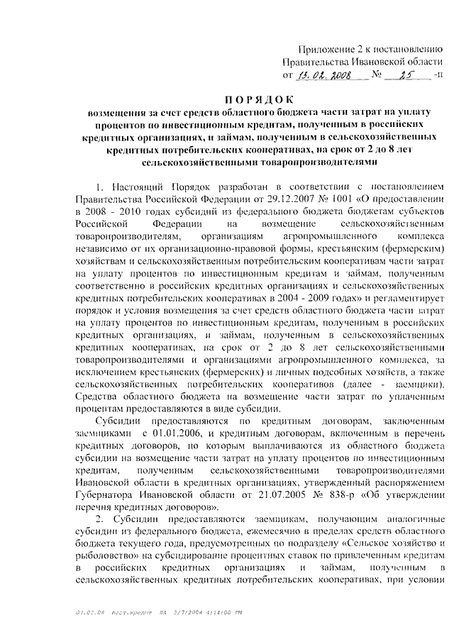 Постановление Правительства Ивановской области от 13.02.2008 N 25-п "Об утверждении Порядков предоставления из областного бюджета возмещения части затрат на уплату процентов по кредитам (займам), полученным сельскохозяйственными товаропроизводителями и организациями агропромышленного комплекса" (вместе с "Порядком возмещения за счет средств областного бюджета части затрат на уплату процентов по кредитам, полученным в российских кредитных организациях, и займам, полученным в сельскохозяйственных кредитных потребительских кооперативах, на срок до одного года сельскохозяйственными товаропроизводителями и организациями агропромышленного комплекса", "Порядком возмещения за счет средств областного бюджета части затрат на уплату процентов по инвестиционным кредитам, полученным в российских кредитных организациях, и займам, полученным в сельскохозяйственных кредитных потребительских кооперативах, на срок от 2 до 8 лет сельскохозяйственными товаропроизводителями", "Порядком возмещения за счет средств областного бюджета части затрат на уплату процентов по кредитам, полученным в российских кредитных организациях, и займам, полученным в сельскохозяйственных кредитных потребительских кооперативах, личными подсобными хозяйствами, сельскохозяйственными потребительскими кооперативами, крестьянскими (фермерскими) хозяйствами на срок от 2 до 8 лет")