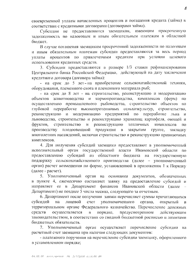 Постановление Правительства Ивановской области от 13.02.2008 N 25-п "Об утверждении Порядков предоставления из областного бюджета возмещения части затрат на уплату процентов по кредитам (займам), полученным сельскохозяйственными товаропроизводителями и организациями агропромышленного комплекса" (вместе с "Порядком возмещения за счет средств областного бюджета части затрат на уплату процентов по кредитам, полученным в российских кредитных организациях, и займам, полученным в сельскохозяйственных кредитных потребительских кооперативах, на срок до одного года сельскохозяйственными товаропроизводителями и организациями агропромышленного комплекса", "Порядком возмещения за счет средств областного бюджета части затрат на уплату процентов по инвестиционным кредитам, полученным в российских кредитных организациях, и займам, полученным в сельскохозяйственных кредитных потребительских кооперативах, на срок от 2 до 8 лет сельскохозяйственными товаропроизводителями", "Порядком возмещения за счет средств областного бюджета части затрат на уплату процентов по кредитам, полученным в российских кредитных организациях, и займам, полученным в сельскохозяйственных кредитных потребительских кооперативах, личными подсобными хозяйствами, сельскохозяйственными потребительскими кооперативами, крестьянскими (фермерскими) хозяйствами на срок от 2 до 8 лет")
