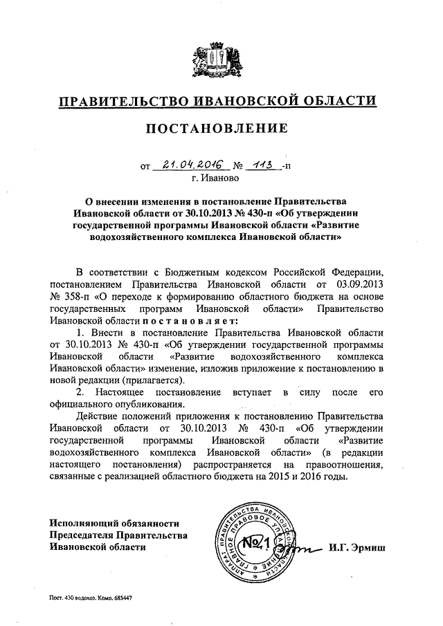 Постановление Правительства Ивановской области от 21.04.2016 N 113-п "О внесении изменения в постановление Правительства Ивановской области от 30.10.2013 N 430-п "Об утверждении государственной программы Ивановской области "Развитие водохозяйственного комплекса Ивановской области"