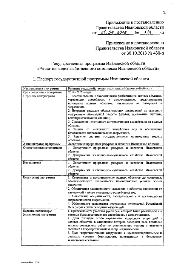 Постановление Правительства Ивановской области от 21.04.2016 N 113-п "О внесении изменения в постановление Правительства Ивановской области от 30.10.2013 N 430-п "Об утверждении государственной программы Ивановской области "Развитие водохозяйственного комплекса Ивановской области"