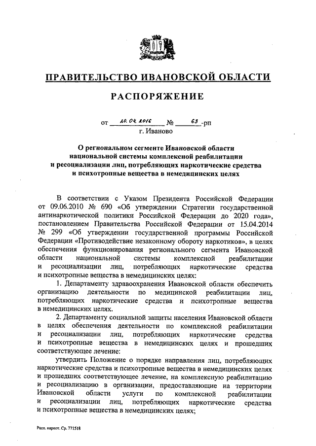 Распоряжение Правительства Ивановской области от 20.04.2016 N 63-рп "О региональном сегменте Ивановской области национальной системы комплексной реабилитации и ресоциализации лиц, потребляющих наркотические средства и психотропные вещества в немедицинских целях"