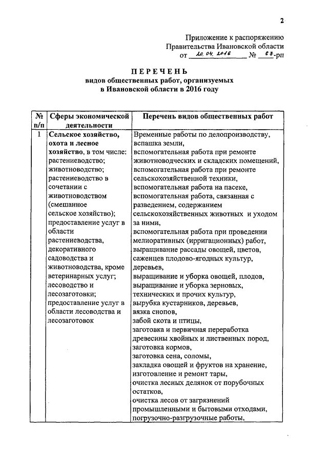 Распоряжение Правительства Ивановской области от 20.04.2016 N 67-рп "Об утверждении перечня видов общественных работ, организуемых в Ивановской области в 2016 году"
