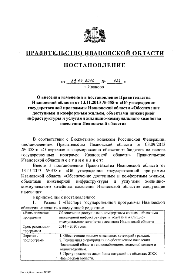 Постановление Правительства Ивановской области от 29.04.2016 N 124-п "О внесении изменений в постановление Правительства Ивановской области от 13.11.2013 N 458-п "Об утверждении государственной программы Ивановской области "Обеспечение доступным и комфортным жильем, объектами инженерной инфраструктуры и услугами жилищно-коммунального хозяйства населения Ивановской области" (вместе с "Подпрограммой "Повышение эффективности организации строительства, реконструкции и капитального ремонта объектов, находящихся в собственности Ивановской области")